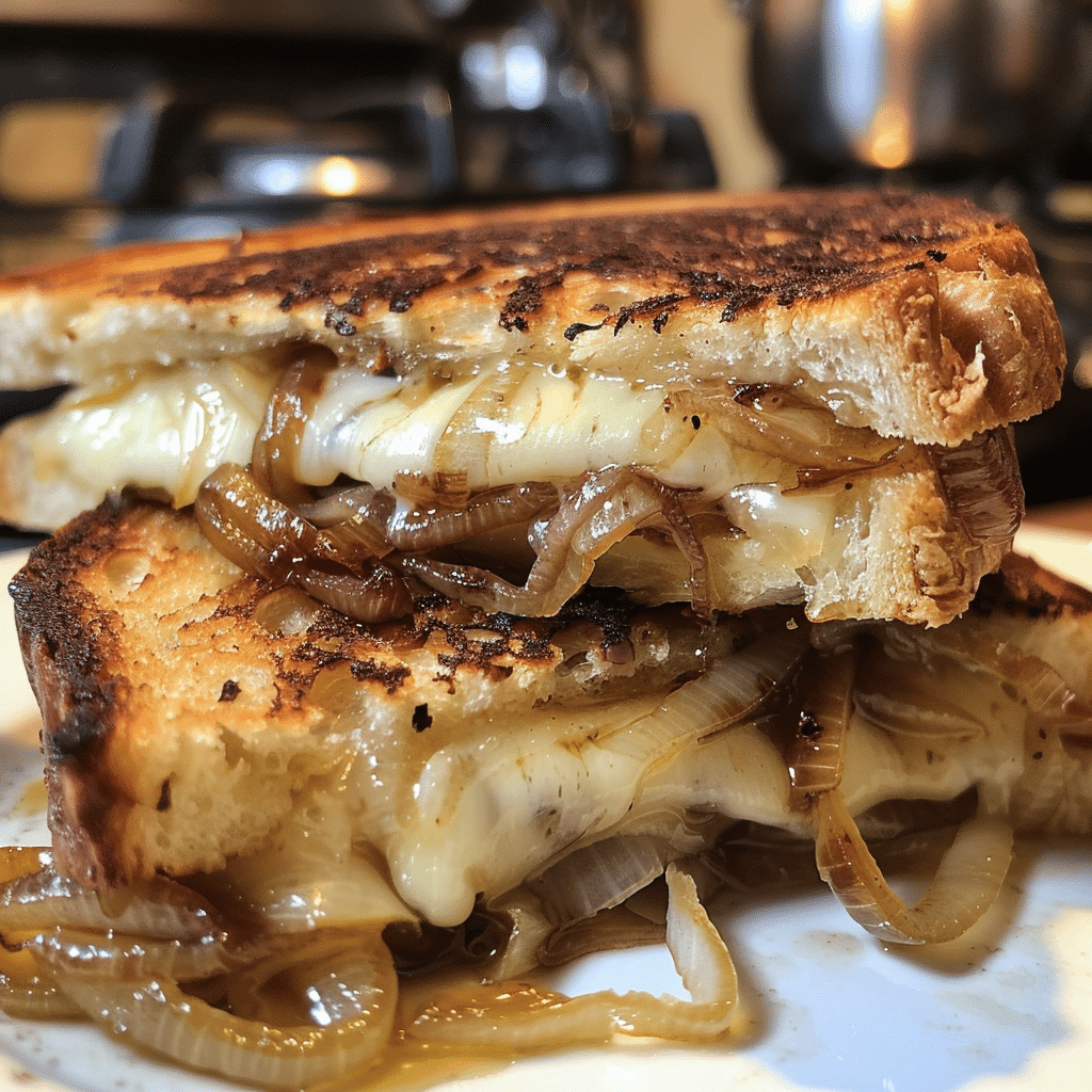 A gourmet twist on the classic grilled cheese sandwich, layered with sweet caramelized onions and gooey melted cheese for a rich, comforting bite.